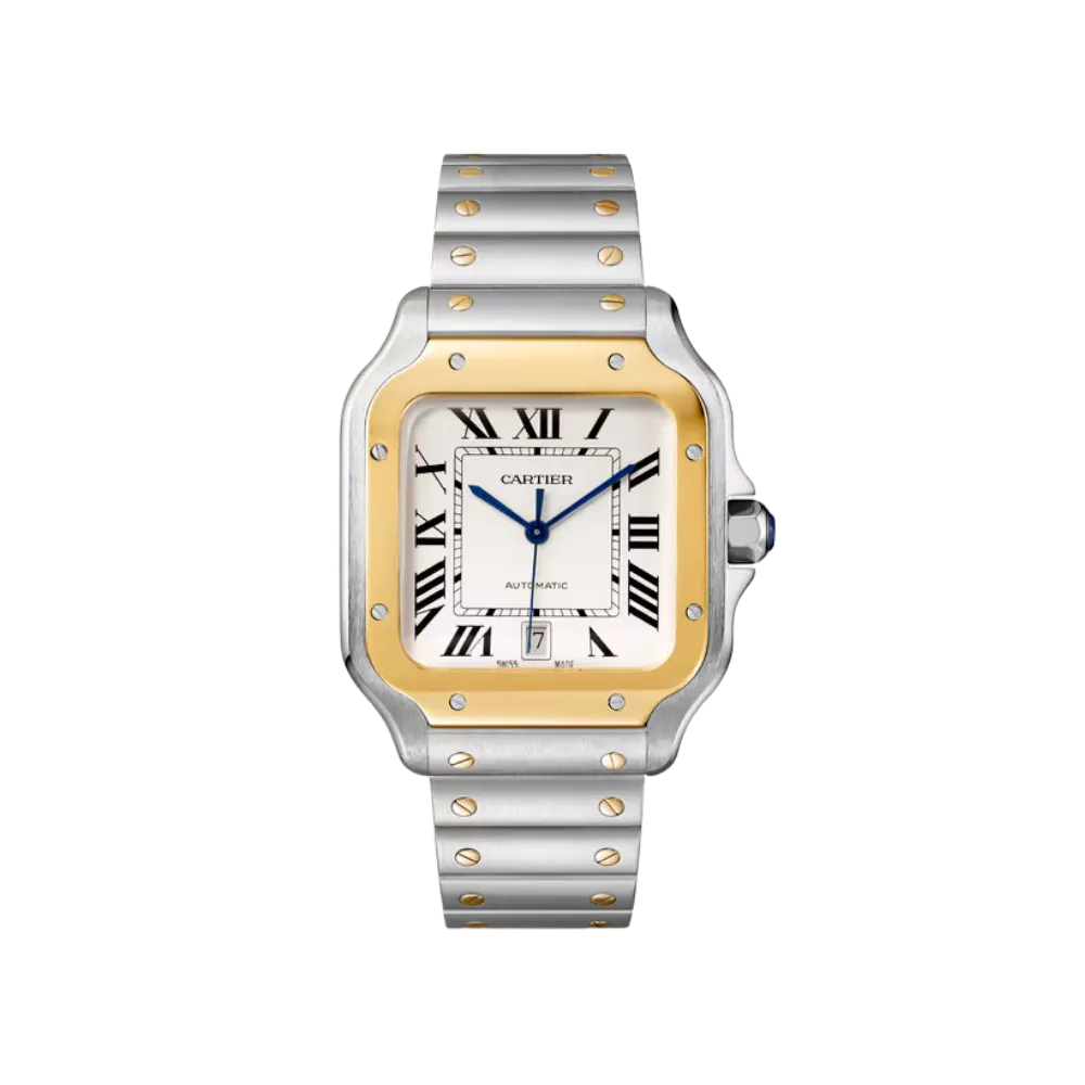 This large model features a 39.8mm square stainless steel case, crowned with a polished 18-carat yellow gold bezel secured with the signature exposed screws—a hallmark of the Santos design. The clean, silvered opaline dial is enhanced by black Roman numeral hour markers, a rail-track chapter ring, and blued-steel sword-shaped hands, offering optimal legibility and a distinct Parisian aesthetic. Santos de Cartier Large Steel & 18ct Yellow Gold Bracelet/Strap Watch.