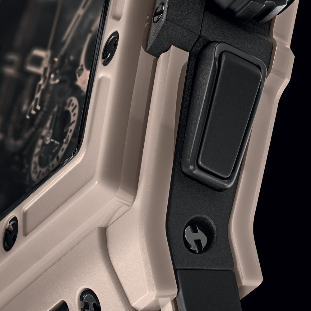 - Strap: White structured rubber strap with beige ceramic and titanium deployant clasp, interchangeable with Hublot’s One-Click system.