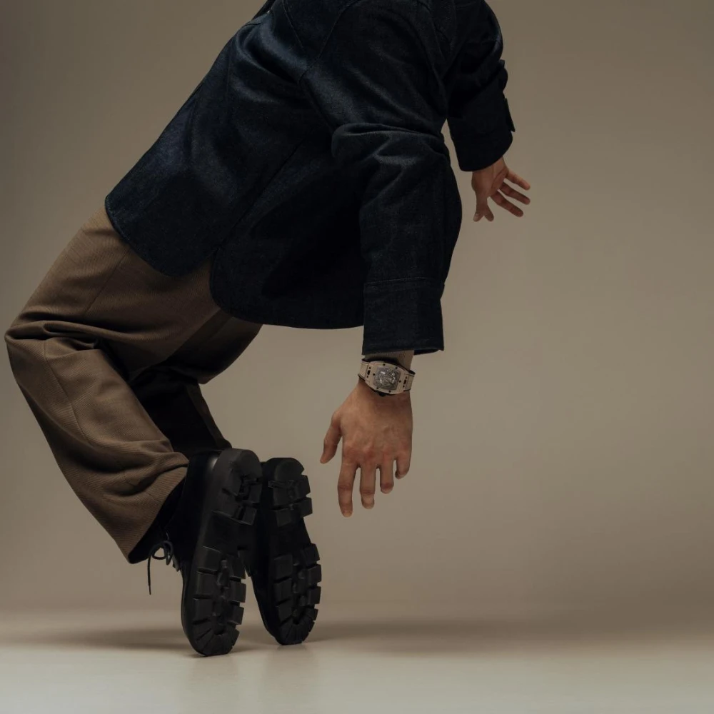 - Dial: Skeletonized sapphire dial with rhodium-plated hands and beige details, combining technical depth with subtle elegance.