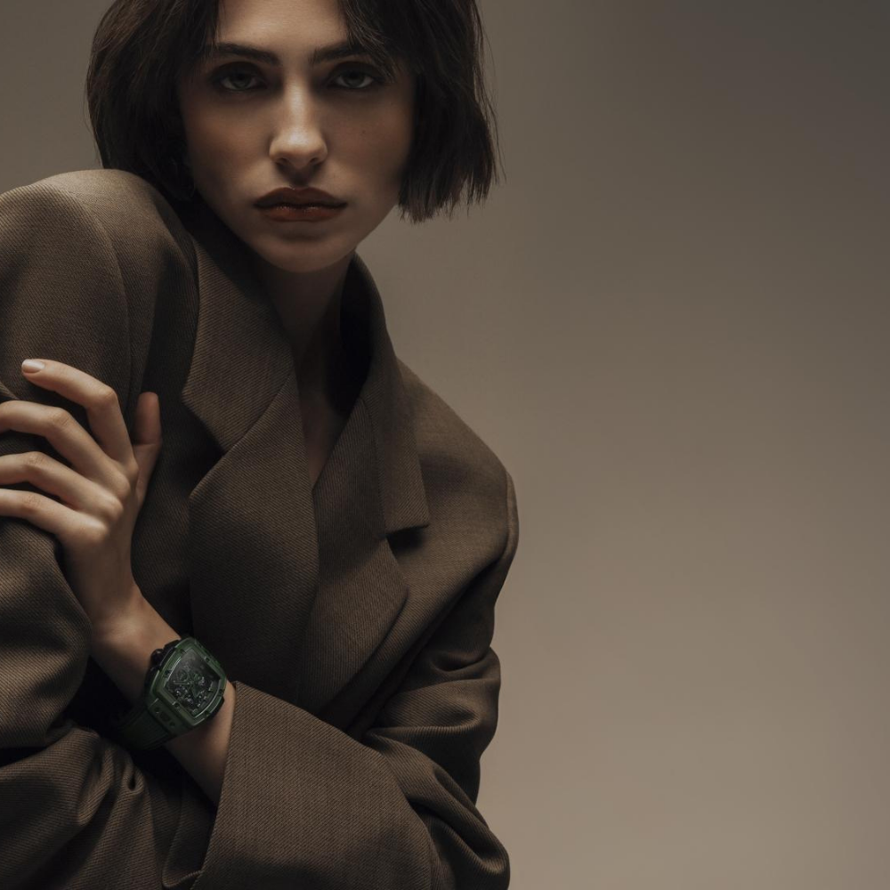 • Dial: Skeleton dial with sapphire base, rhodium-plated hands, and luminous green accents.